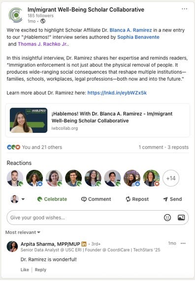 The Im/migrant Well-Being Scholar Collaborative produces, “¡Hablemos!,” which is an interview series that explores the multifaceted nature of immigration studies, advocacy, partnership, and more. Check out one of our latest features in the series with Dr. Blanca A. Ramirez: